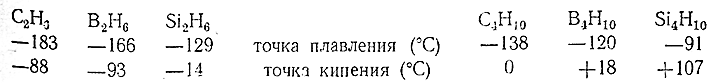 Бораны бесцветны и по физическим свойствам очень похожи на углеводороды и силаны аналогичного состава, как это видно из приводимого ниже сопоставления:
