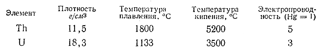 В свободном состоянии элементы семейства актинидов могут быть получены электролизом их расплавленных солей. Более или менее детально описаны свойства лишь тория и урана, важнейшие константы которых сопоставлены ниже: