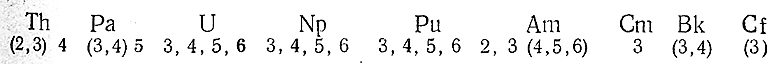 Наиболее характерные валентности выделены жирным шрифтом, а наименее характерные или малоизученные даны в скобках. Как видно из приведенного сопоставления, первоначально (от Th до U) имеет место возрастание наиболее характерной валентности, а затем (от U до Cm) – ее снижение.