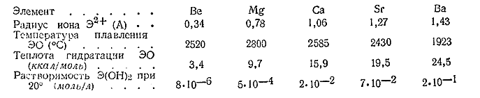 Окиси кальция и его аналогов (ЭО) представляют собой белые тугоплавкие вещества, энергично присоединяющие воду с образованием белых гидроокисей [Э(ОН)2 ]. Последние являются сильными основаниями, довольно хорошо растворимыми в воде. По ряду Са—Sr—Ва основной характер гидроокисей усиливается.