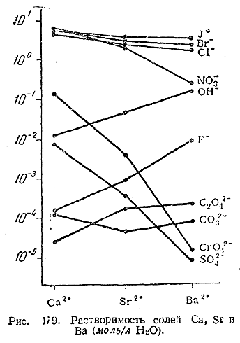 2) Растворимость важнейших солей (а также гидроокисей) Са, Sr и Ва при обычных условиях сопоставлена на рис. 179, из которого видно, что для отдельных анионов по ряду Са–Sr–Ва она изменяется различно.Это обстоятельство важно для аналитической химии. В частности, резкое различие растворимости хромовокислых солей дает возможность отделять Ва от Sr и Са. Крайне малой растворимостью щавелевокислого кальция пользуются для открытия следов этого элемента (например, в обычной питьевой воде).