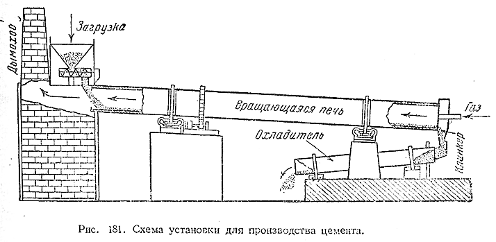 4) При производстве цемента смесь тонко измельченных известняка и богатой SiO2 глины обжигают до начала спекания (1400–1600 °С) в специальных вращающихся печах (рис. 181). Последние представляют собой слегка наклонные, выложенные внутри огнеупорным кирпичом стальные трубы диаметром 2–3 м и длиной в несколько десятков метров. Печь лежит на роликах и приводится мотором в медленное вращение. В ее верхнюю часть непрерывновводится исходная смесь, которая при постепенном продвижении вниз все более разогревается за счет тепла сгорающих в печи газов (или каменноугольной пыли). Обожженный продукт (цементный клинкер) после остывания тщательно перемалывается.