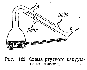 2) Важное использование ртути связано с получением высокого вакуума. Для этого обычно служит изготовляемый из стекла или металла ртутный вакуумный насос, схематически показанный на рис. 182. Нагреванием до кипения заполняющей нижнюю часть сосуда ртути соз дается непрерывная струя ее пара, котораясквозь узкую трубку с большой скоростью поступает в охлаждаемое снаружи водой пространство, присоединенное к откачиваемому сосуду через А. Быстро летящие атомы ртути своими ударами гонят молекулы откачиваемого газа к отводу Б, где эти молекулы попадают под действие более грубого насоса («фор–вакуумного»), дающего всей системе предварительное разрежение порядка О,1 –0,01 мм рт. ст. Сами ртутные пары конденсируются в охлаждаемом пространстве, и жидкая ртуть вновь поступает в нагреваемый сосуд. Установка работает непрерывно и способна создать вакуум с давлением до стомиллионных Долей миллиметра ртутного столба.