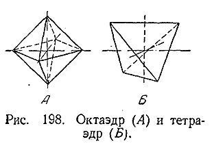 Пространственная структура внутренней сферы комплекса определяется, в основном, координационным числом и стремлением к достижению максимальной компактности (плотности) упаковки частиц. Если представить себе комплексообразова–тель находящимся в центре соответствующей фигуры, то для координационного числа 6 характерно расположение адден–дов по углам октаэдра (рис. 198, Л), а для координационного числа 4 – по углам тетраэдра (рис. 198, Б). Октаэдрическое расположение аддендов было установлено, в частности, для иона (PtCl6 ]2–(рис. 199). При координационных числах 4 и ниже значительную роль для относительной устойчивости того или иного пространственного расположения играют индивидуальные особенности комплексообразователя и аддендов. Поэтому, например, для координационного числа 4, кроме тетраэдрического, стано вится возможным и расположение аддендов по углам квадрата (с комплексообразователем в центре характерное, в частности, для производных двухвалентной платины (рис. 200).
