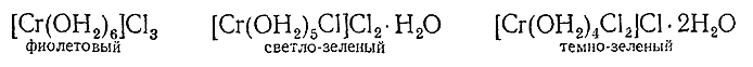 Помимо отвечающего эмпирической формуле CrCl3 ·6H2 O фиолетового соединения, известны еще два кристаллогидрата того же состава – светло–зеленый и темно–зеленый. На примере этих трех веществ мы впервые встречаемся с изомерией комплексных соединений, т. е. существованием среди них тождествнных по составу, но различных по структуре образований (X § 2).