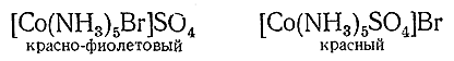Подобная изомерия, зависящая от различного расположения молекул воды (гидратная изомерия), известна для ряда соединений. Близко к ней стоит ионизационная изомерия, связанная с различной легкостью диссоциации ионов из внутренней и внешней сфер. Например, для соединения состава Co(Br)SO4 ·5NH3 известны два изомера – красно–фиолетовый и красный. Свежеприготовленный раствор первого из них не дает осадка с ионами Ag+, но дает его с ионами Ва2+, раствор второго – наоборот. Отсюда вытекает, что обоим изомерам отвечают следующие структуры: