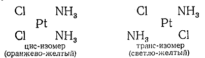 Например, соединение состава [Pt(NH3 )2 Cl2 ] способно существовать в двух формах, из которых одна имеет оранжево–желтый, а другая – светло–желтый цвет. Помимо окраски, обе формы отличаются друг от друга и способом образования и рядом свойств. Ближайшее изучение последних указывает на то, что структурам обоих изомеров отвечает различное расположение аддендов з квадратной внутренней сфере (характерной для комплексных производных двухвалентной платины) друг относительно друга, как это видно из приводимых ниже схем: