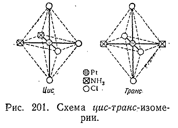 Оба эти соединения способны присоединять по два атома хлора (с повышением валентности платины до четырех и ее координационного числа до шести), причем продуктами взаимодействия оказываются опять–таки вещества с различными свойствами. В частности, цис–изомер имеет оранжевую окраску, а транс–изомер – желтую. Структура того и другого схематически показана на рис. 201. Совершенно подобная же изомерия известна для ряда других комплексов с шестью аддендами, из которых два отличаются от четырех других. При наличии во внутренней сфере трех и т. д. разных типов аддендов число возможных пространственных изомеров еще повышается.