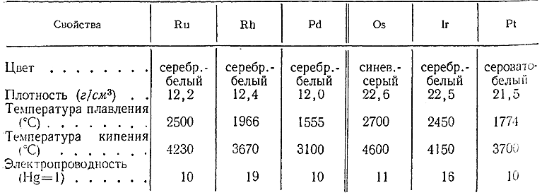 В свободном состоянии элементы платиновой группы представляют собой тугоплавкие и труднолетучие металлы, по плотности разделяемые иногда на легкие (Ru, Rh, Pd) и тяжелые (Os, Ir, Pt). Их важнейшие константы сопоставлены ниже: