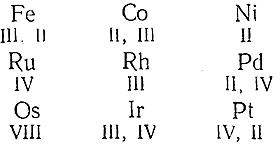 Почти все элементы VIII группы образуют соединения, отвечающие нескольким различным валентностям, причем изменение последних осуществляется сравнительно легко. При переходе в группе снизу вверх и слева направо наиболее типичная для того или иного элемента валентность в общем, как это видно из приводимого сопоставления, понижается: