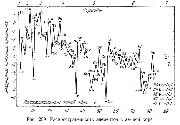 Как показывают приведенные данные, из общего числа составляющих земную кору (все три оболочки – воздушную, водную и верхнюю часть твердой) атомов 99,4% приходится на долю только 15 элементов, а содержание всех остальных вместе взятых составляет лишь 0,6%. Из рис. 209 видно, что относительная распространенность элементов является хотя и очень сложной, но все же определенно периодической функцией положительного заряда ядра.