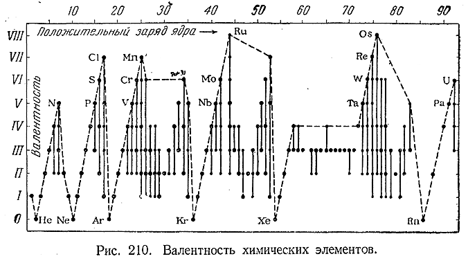 Валентности химических элементов сопоставлены на рис. 210, причем более характерные из них обозначены точками большегоразмера. Хотя валентность, вообще говоря, зависит от природы обоих взаимодействующих атомов (а также и от внешних условий), однако у многих элементов она остается практически постоянной. Для других (например, Mn, Ru) наблюдается, наоборот, проявление очень большого ее разнообразия.