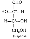трео- — приставка, обозначающая, что в соединении два смежных асимметрических центра имеют одинаковую конфигурацию (как у моносахарида треозы); в противоположность этому приставка эритро- указывает на различную конфигурацию этих центров (как у моносахарида эритрозы):