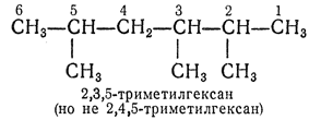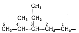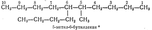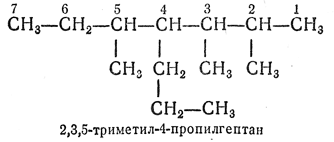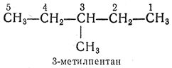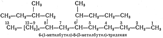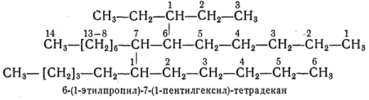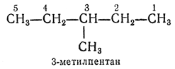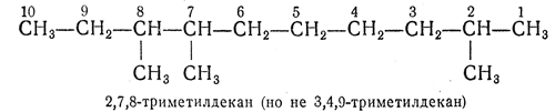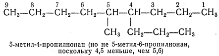 2.2. — Самую длинную цепь нумеруют от одного конца до другого арабскими цифрами, причем направление нумерации выбирают так, чтобы цифры (номера), указывающие положение боковых цепей, были наименьшими. Если при нумерации цепи с одного или с другого конца получаются различающиеся ряды нескольких цифр (номеров), их сравнивают, расположив цифры в рядах