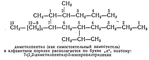 2.4. — Если две или более боковые цепи находятся в равнозначном положении, более низкий номер получает та цепь, которая в названии перечисляется первой, независимо от того, соблюдается ли порядок возрастающей сложности или алфавитный.