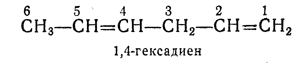 3.1. — Ненасыщенные неразветвленные углеводороды с одной двойной связью называют, заменяя окончание -ан в названии соответствующего насыщенного углеводорода окончанием -ен. Наличие двух или более двойных связей обозначают окончаниями -адиен, -атриен и т. д. Родовые названия углеводородов (разветвленных и неразветвленных) с одной, двумя, тремя и т. д. двойными связами — алкены, алкадиены, алкатриены и т. д. Цепи нумеруют так, чтобы положения двойных связей обозначались наиболее низкими номерами. Примеры: