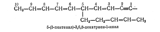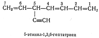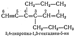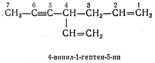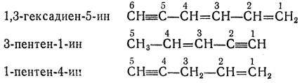 3.3. — Ненасыщенные неразветвленные ациклические углеводороды, имеющие как двойные, так и тройные связи, называют, заменяя в названии соответствующего насыщенного углеводорода окончание -ан окончаниями -енин, -адиенин, -атриенин, -ендиин и т. д. Двойные и тройные связи должны получить возможно более низкие номера, даже если при этом -ин получит меньший номер чем -ен. Если же при нумерации возможен выбор, наименьшими номерами следует обозначить двойные связи.
