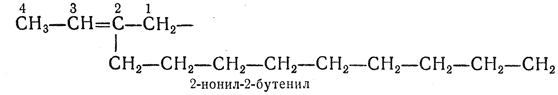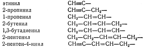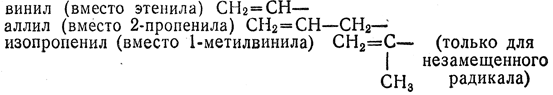 3.5. — Названия одновалентных радикалов, полученных из ненасыщенных ациклических углеводородов, имеют окончания -енил, -инил, -диенил и т. д., причем, если необходимо, указывают положение двойных связей. Атом углерода со свободной валентностью обозначают номером 1,