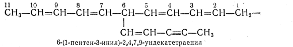 3.6. — В качестве основной цепи в радикале выбирают ту, которая содержит: (1) максимальное число двойных и тройных связей; (2) максимальное число атомов углерода и (3) максимальное число двойных связей.