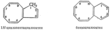 Для обозначения присоединения моноциклических группировок кроме префикса бензо- приняты также следующие названия, обозначающие группировки с максимально возможным числом некумулированных двойных связей: циклопента, циклогепта, циклоокта, циклонона и т. д. Если основной компонент — моноциклическая система, то окончание -ен в его названии обозначает наличие не одной двойной связи, а максимально возможного числа некумулированных двойных связей.