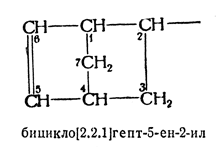 31.4. — Радикалы, полученные из мостиковых углеводородов, называют в соответствии с принципами, изложенными в правиле А—11.4. Нумерация углеводородов сохраняется, и точке или точкам присоединения даются номера настолько наиболее низкие, насколько это совместимо с нумерацией, установленной для углеводорода.