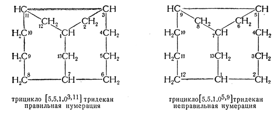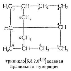 32.11. — Циклические углеводородные системы, состоящие из трех или более колец, могут быть названы в соответствии с принципами, изложенными в правиле А—31. Вместо префикса бицикло- перед названием углеводорода с открытой цепью с тем же числом атомов углерода ставят соответствующий префикс трицикло-, тетрацикло- и т. д.