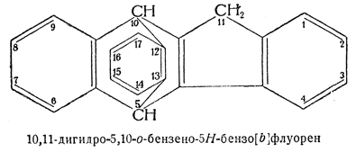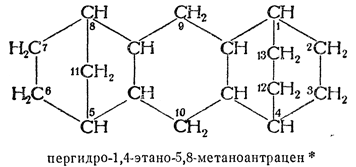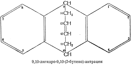 34.1. — Полициклические углеводородные системы, которые, согласно правилу А—21, можно рассматривать как орто-конденсированные или орто- и пери-конденсированные и имеющие в то же время другие мостики, которые можно рассматривать как заместители, называют, приняв за основу орто- или орто- и пери-конденсированную систему. Дополнительные мостики — заместители обозначают затем префиксами, образованными из названия соответствующего углеводорода заменой окончания -ан, -ен и т. д. окончаниями -ано, -ено и т. д.; положение мостиков указывается номерами точек присоединения к основной системе. Если имеются мостики различных типов, их перечисляют в алфавитном порядке.