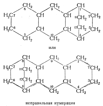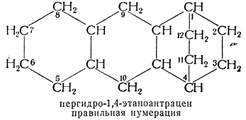 34.2. — Основную орто- или орто- и пери-конденсированную систему нумеруют, как указано в правиле А—22. Если есть возможность выбора, узловые атомы мостика должны быть обозначены наиболее низкими номерами. Сами мостики затем нумеруют поочередно, начиная каждый раз от мостикового атома, ближайшего к узлу, имеющему наибольший номер.