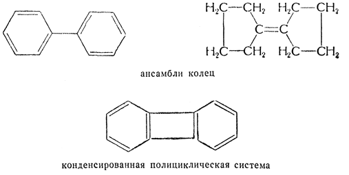 51.1. — Соединения, содержащие две или более циклических систем (отдельные кольца или конденсированные системы), которые непосредственно соединены друг с другом двойными или простыми связями, причем число таких непосредственных связей меньше, чем число соответствующих циклических систем, называют ансамблями колец.