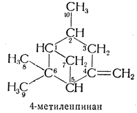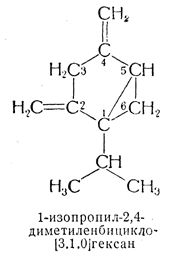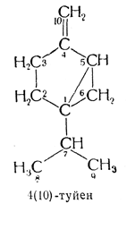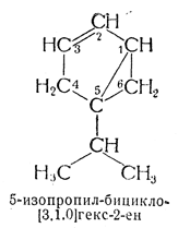74.1. — Бициклические терпеновые углеводороды, имеющие скелет формулы II или такой же скелет и дополнительные боковые цепи, кроме входящих в этот скелет метила и изопропила (или метилена — если одна метиленовая группа уже имеется), называют как туйан, туйен, туйадиен и т. д. и нумеруют по системе, принятой для туйана (формула II). Другие углеводороды с кольцевым скелетом туйана получают название от бицикло[3.1.0]гексана и нумерацию в них ведут по системе, принятой для бициклосоединений (см. правило А—31).