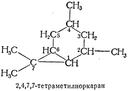 74.2. — Бициклические терпеновые углеводороды, имеющие скелеты формул III, IV или V и, кроме метила (или метилена — если одна метиленовая группа уже имеется}, дополнительные боковые цепи, называют соответственно: каран, карен, карадиен и т. д.; пинан, пинен, пинадиен и т. д.; борнан, борнен, борнадиен и г. д. Их нумеруют как установлено, соответственно, для карана (формула III), пинана (формула IV) и борнана (формула V). Другие углеводороды, содержащие кольцевой скелет карана, пинана или борнана, получают названия соответственно от норкарана (формула VI), норпинана (формула VII) или норборнана (формула VIII). Эти названия более предпочтительны, чем названия от бицикло[4.1.0]гептана, бицикло[3.1.1]гептана или бицикло[2.2.1]гептана. Соединения с нор-названиями нумеруют по системе, принятой для бициклосоединений (см. правило А—31).