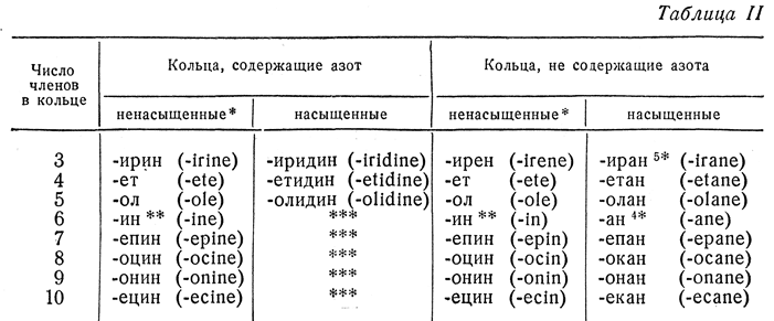5* Слоги, обозначающие величину колец, содержащих 3, 4 или 7—10 членов, происходят: «ир» от tri-; «ет» от tetra-; «еп» от hepta-; «оц» и «ок» от octa-; «он» от nопа-; «ец» и «ек» от deca-.