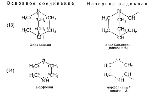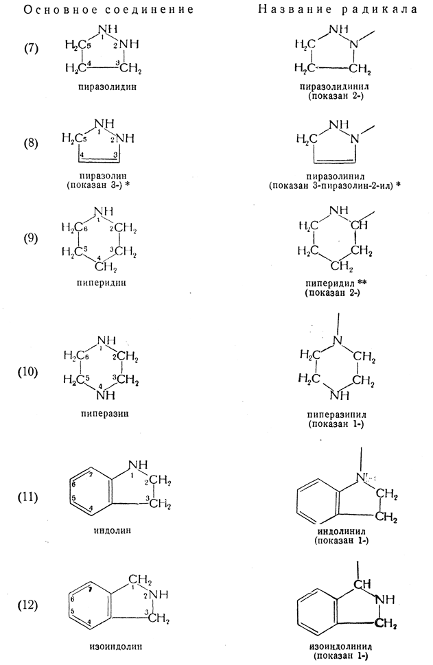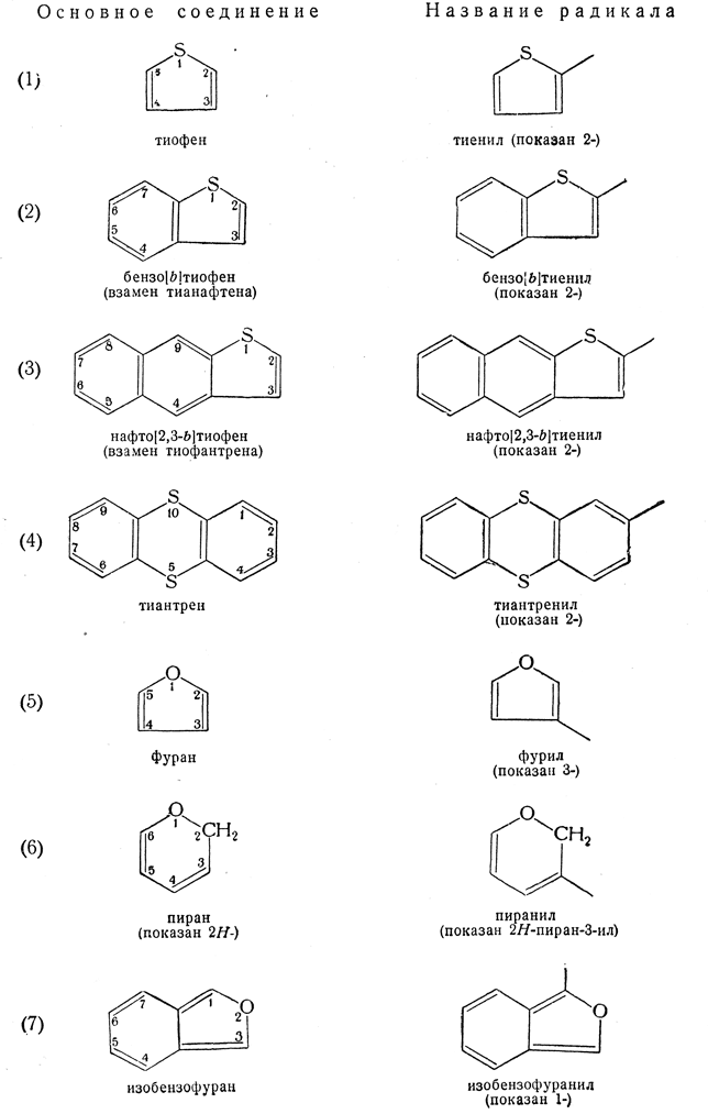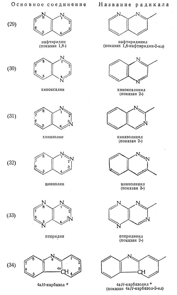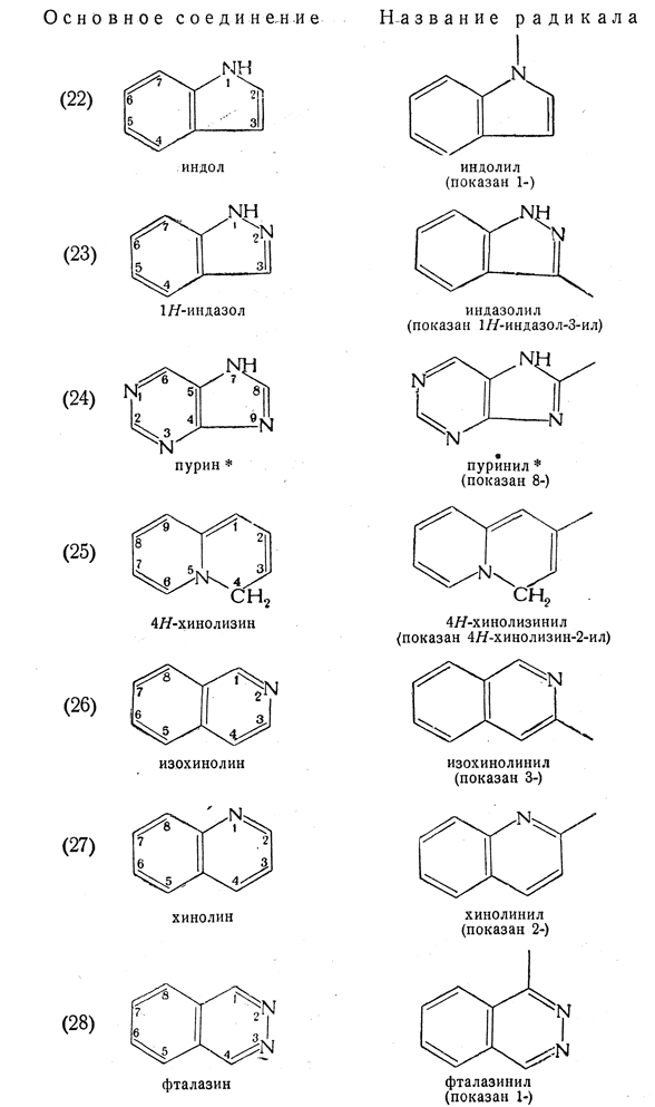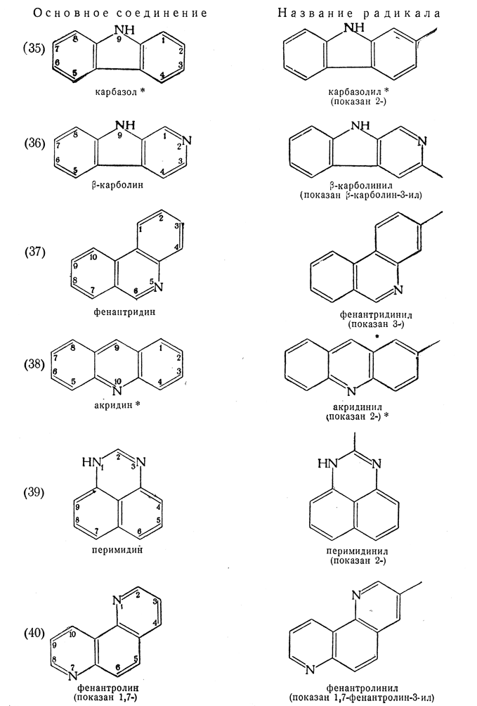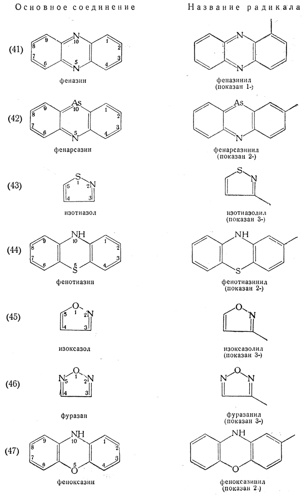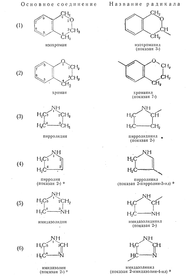 2.11. — Ниже приведен неполный перечень тривиальных и полутривиальных названий, которые сохраняются для соответствующих соединений и служат основой названий конденсированных систем. Они расположены в порядке, противоположном тому, который принят в правиле В—3. Названия показанных радикалов образуются по правилу В—5.