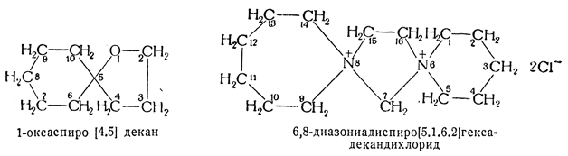 10.1. — Названия гетероциклических спиросоединений, отдельные звенья которых представляют собой только простые моноциклические структуры, могут быть образованы путем прибавления «а»-обозначений гетероатомов (см. табл. I, правило В—1.1) в качестве префиксов к названиям спироуглеводородов, составленным по правилам А—41.1, А—41.2, А—41.3 и А—41.6. Нумерация спироуглеводородов сохраняется, и гетероатомы, в соответствии с порядком, указанным в табл. I, должны получить настолько низкие номера, насколько это допускает нумерация циклической системы. Если есть возможность выбора, то гетероатомам должны быть приписаны более низкие номера, чем двойным связям.