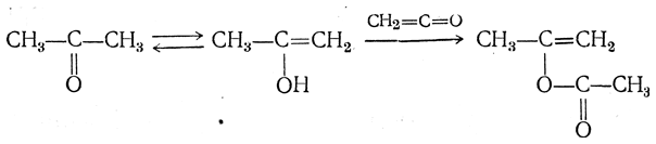 Енолы неустойчивы, и равновесие обычно практически нацело сдвинуто влево. Однако кетоны в некоторых условиях могут реагировать и в енольной форме, давая производные енолов. Например, при действии кетена получаются ацетаты енолов: