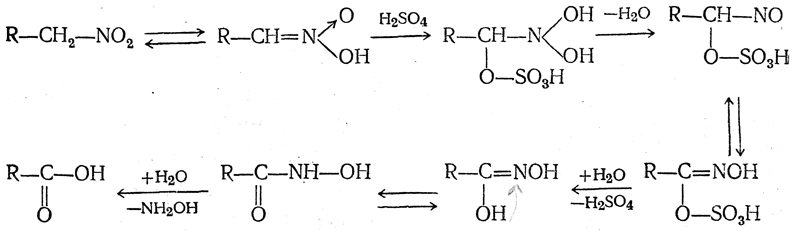 2. Действие концентрированных минеральных кислот. При действии концентрированных минеральных кислот нитросоединения превращаются в карбоновые кислоты, отщепляя гидроксиламин. Это превращение происходит по следующей схеме: