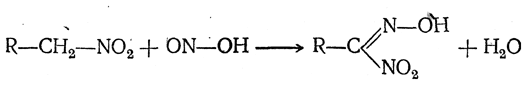 Изомеризация нейтральных нитросоединений в кислые изонитросоединения подтверждается тем, что при действии сильной кислоты на соль изонитросоединения (I) нерастворимое в воде нитросоединение (III) получается не сразу; сначала выделяется хорошо растворимое в воде изонитросоединение (II), лишь постепенно превращающееся в нитросоединение (III):