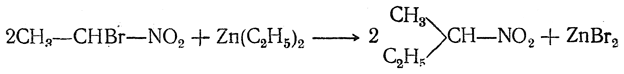 Такое строение образующихся галоиднитросоединений доказывается тем, что при действии на них цинкорганических соединений галоид замещается на алкил и получаются высшие гомологи нитросоединений (И. И. Бевад):