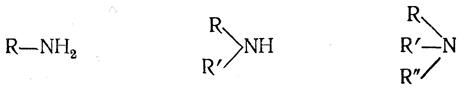 Эти типы аминов по числу атомов водорода, замещенных радикалами, называются первичными, вторичными и третичными аминами. Амины относят к соответствующему типу независимо от того, какие радикалы R (первичные, вторичные или третичные) входят в их состав. Следовательно, применительно к аминам терминам первичный, вторичный и третичный придается другое значение, чем в названиях радикалов.