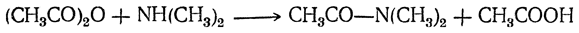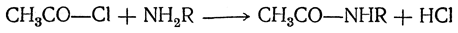 3. Образование N-замещенных амидов кислот (ациламинов). Действием на первичные и вторичные амины галоидангидридов или ангидридов кислот можно заменить связанный с азотом атом водорода на кислотный радикал, причем получаются замешенные при азоте амиды органических кислот, например: