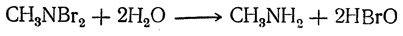 В противоположность взрывчатым галоидным соединениям азота, являющимся продуктами замещения на галоид водорода аммиака, галоидамины совершенно не обладают взрывчатыми свойствами. С водой они могут реагировать с образованием аминов и бромноватистой (или хлорноватистой) кислоты