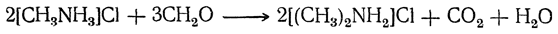 Диметиламин Диметиламин(CH3)2NH содержится вместе с триметиламином в селедочном рассоле и образуется при гниении рыбы и вообще при гниении белковых веществ. Наиболее легкий способ получения диметиламина, как и метиламина, состоит в действии формальдегида на хлористый аммоний; образовавшаяся хлористоводородная соль метиламина реагирует с избыточным формальдегидом: