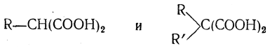 4. Декарбоксилирование двух- и трехосновных кислот. Одноосновные карбоновые кислоты получаются нагреванием двухосновных (и трехосновных) кислот, у которых два (или три) карбоксила находятся при одном и том же атоме углерода: