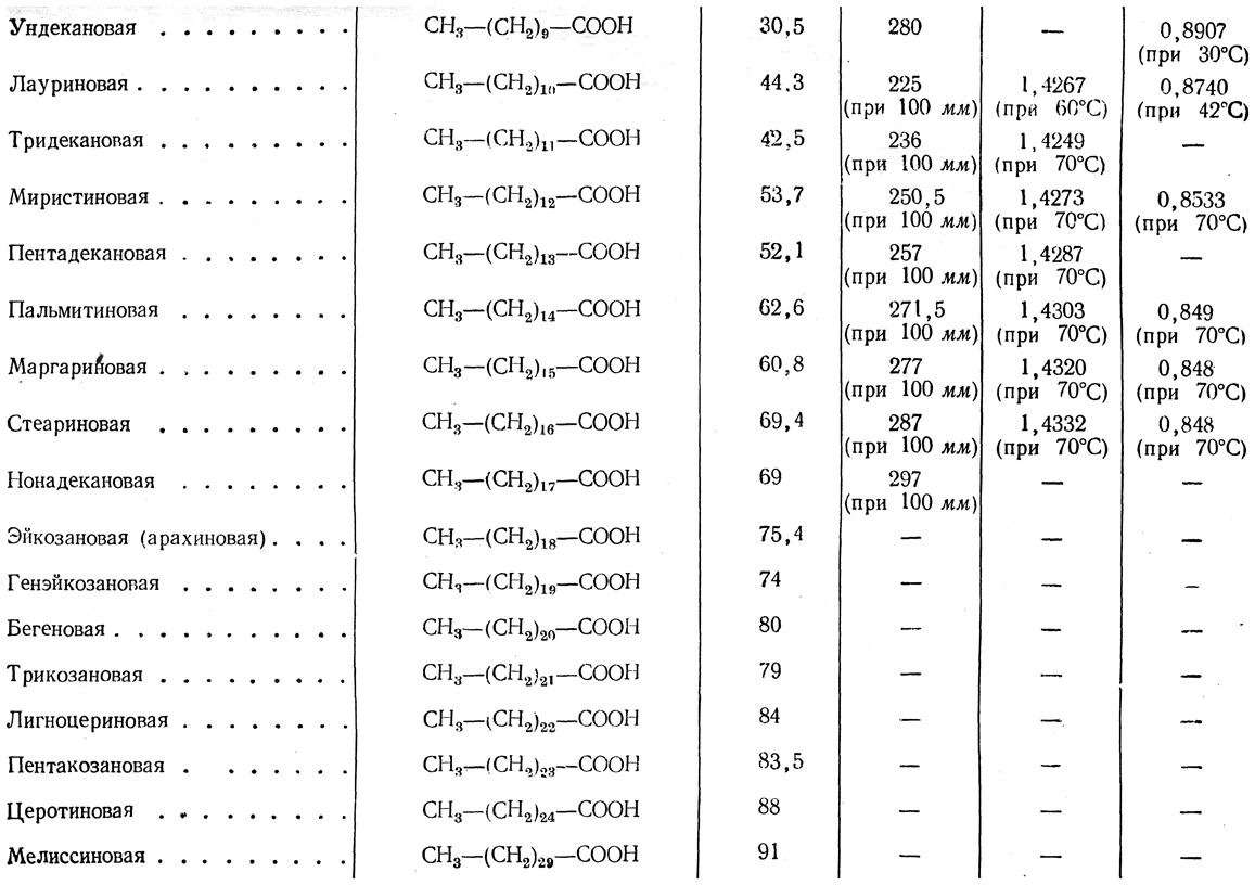 Низшие кислоты легко перегоняются как сами, так и вместес водяным паром, и называются поэтому летучими жирными кислотами. Правильности в повышении температур кипения кислот те же, что и в других гомологических рядах.