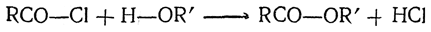 2. Действие спиртов. Взаимодействием хлорангидридов со спиртами получаются сложные эфиры: