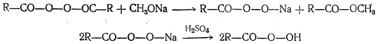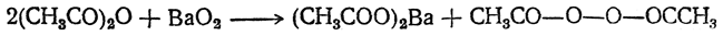 При действии хлор ангидридов или ангидридов кислот на перекись водорода (в отсутствие серной кислоты) или перекиси металлов получаются перекиси кислот, или диацилперекиси, например:
