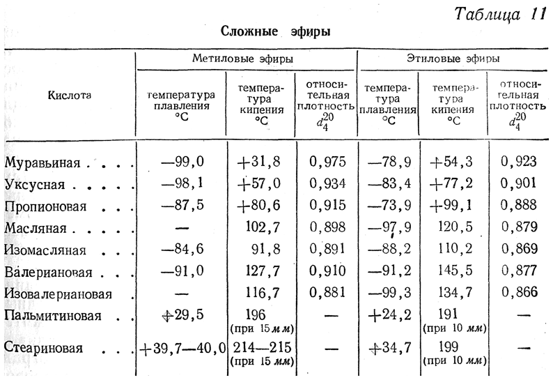 Сложные эфиры жирных кислот и предельных спиртов — жидкости, обладающие приятным фруктовым запахом. Лишь простейшие из них несколько растворимы в воде. Метиловые и этиловые сложные эфиры кипят при более низких температурах, чем соответствующие кислоты.