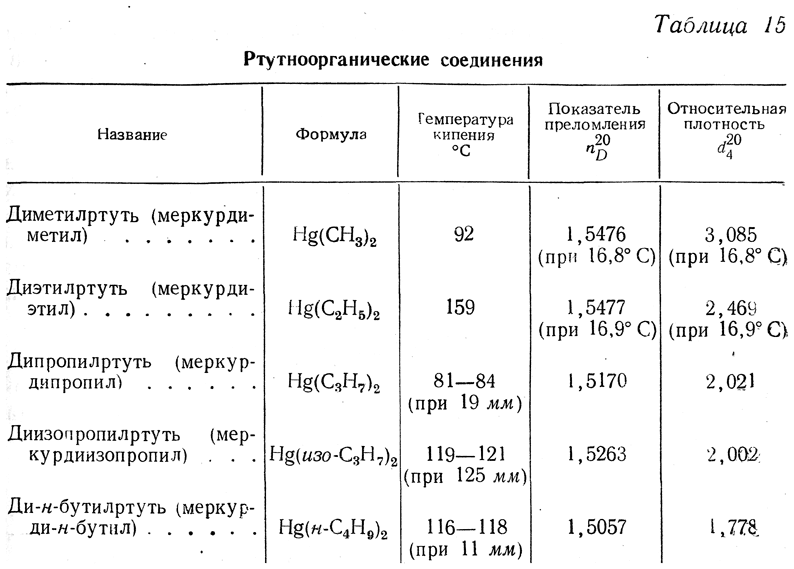 Ртутноорганические диалкильные соединения представляют собой тяжелые, перегоняющиеся без разложения, неприятно пахнущие, очень токсичные жидкости, ведущие себя как типичные гомеополярные соединения.