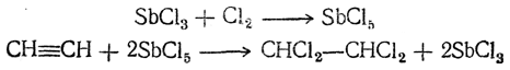 Присоединение хлора к ацетилену в газовой фазе идет очень бурно и может сопровождаться взрывами. Поэтому хлорирование осуществляют в жидкой фазе, в среде готового продукта присоединения хлора (тетрахлорэтана) в присутствии треххлористой сурьмы в качестве катализатора: