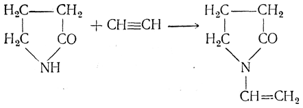 Винилироваться могут и другие соединения, содержащие подвижный атом водорода. Например, при винилировании бутиролактама винильная группа оказывается у атома азота, образуя N-винилпирролидон: